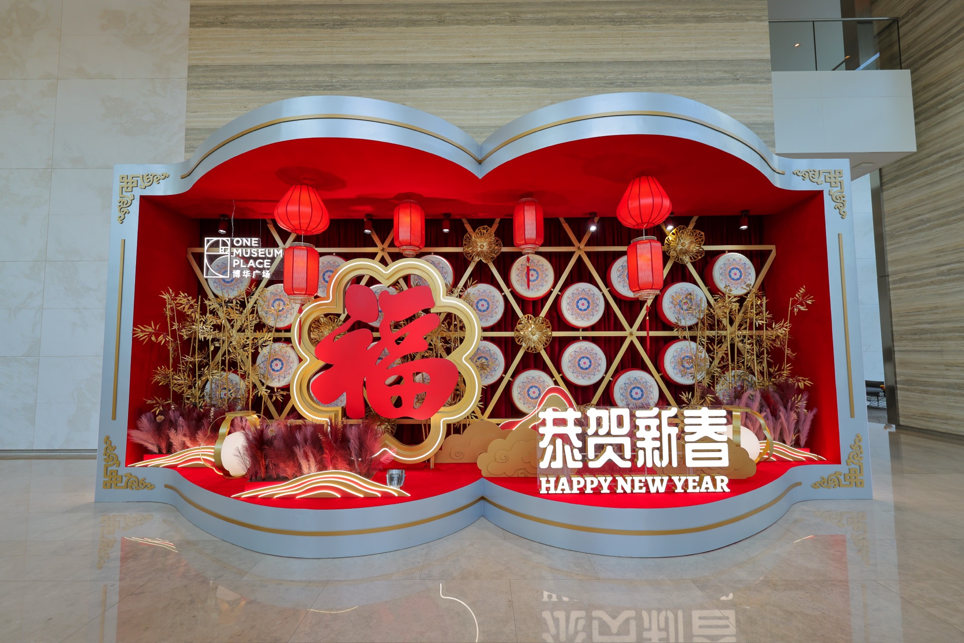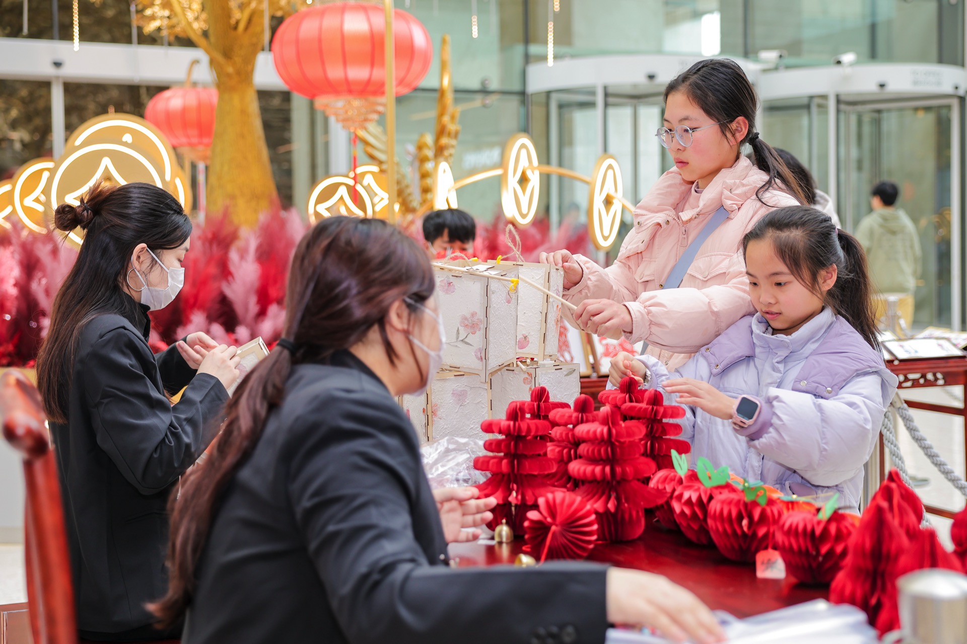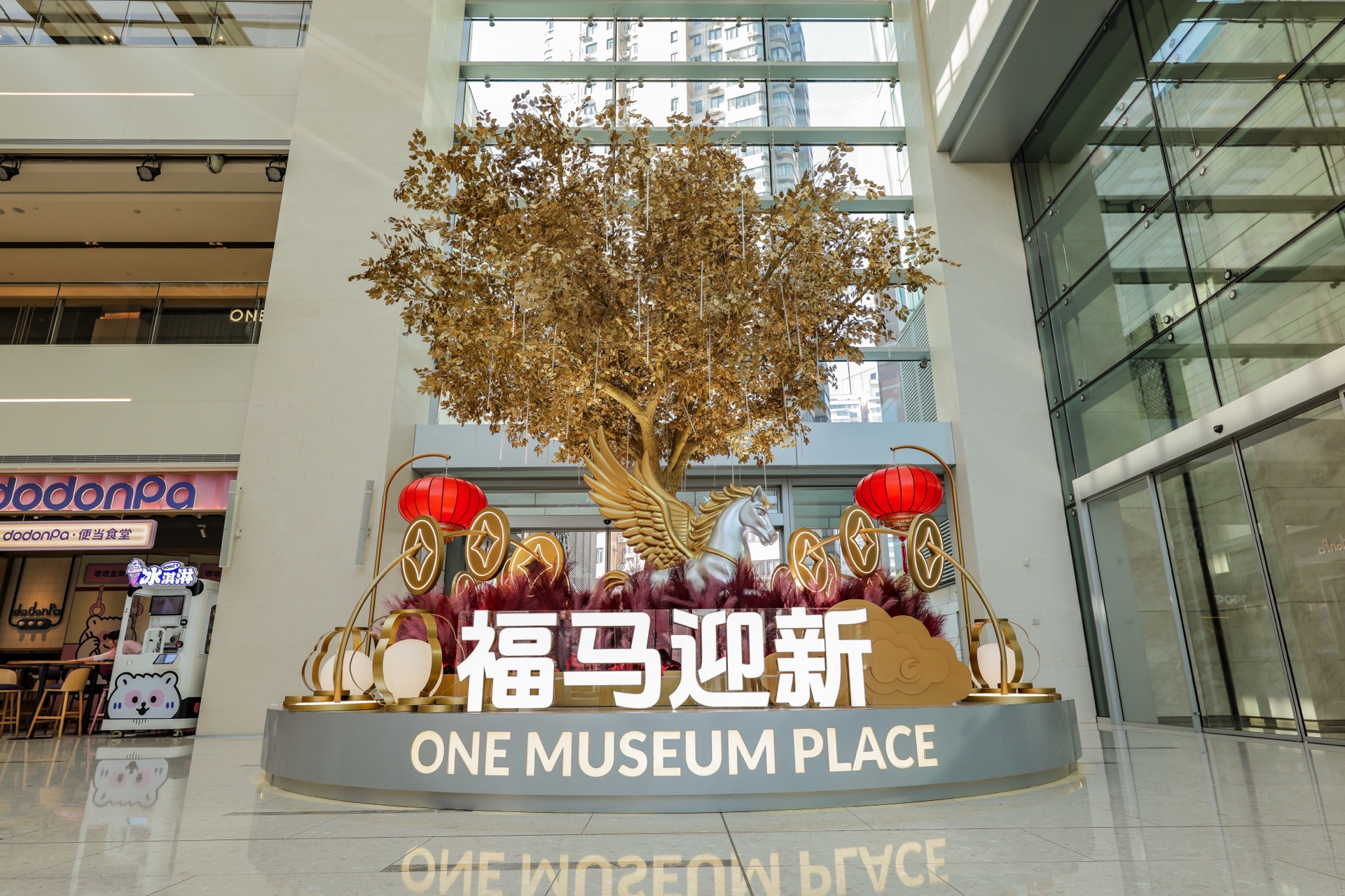 For the 2026 Year of the Horse, One Museum Place’s festive installations exude elegant traditional charm: a wishing tree draped in gilded coins paired with a prancing golden flying horse sculpture, symbolizing soaring fortune and blessings; and a book-shaped display features tastefully arranged red lanterns, “Fu” characters and coins, like unfolding a scroll of new-year bliss. A craft activity was held, where customers redeemed limited traditional handcrafts (flower lanterns, paper-cuttings, etc.) for free with same-day receipts.